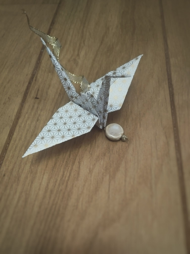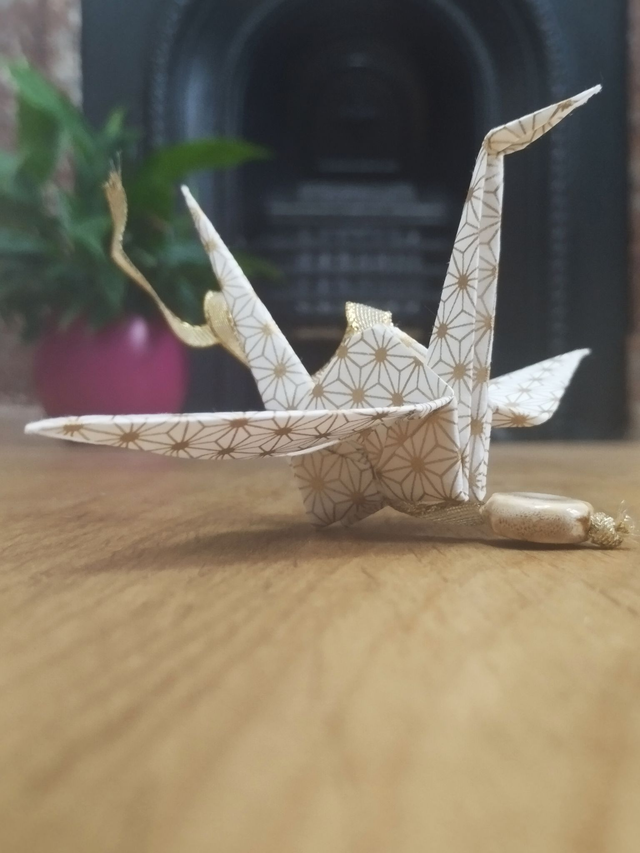 Apportez une touche de poésie et de légèreté à votre intérieur avec cette délicate suspension en forme de grue, entièrement pliée à la main dans un papier japonais aux motifs géométriques blancs et dorées.