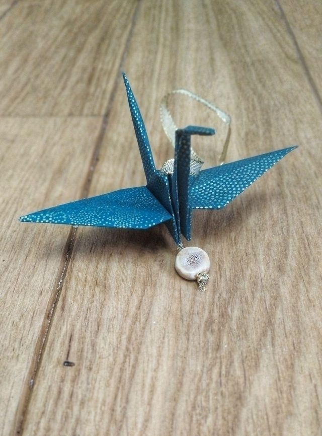 Apportez une touche de poésie et de légèreté à votre intérieur avec cette délicate suspension en forme de grue, entièrement pliée à la main dans un papier japonais aux motifs à poids dorés.